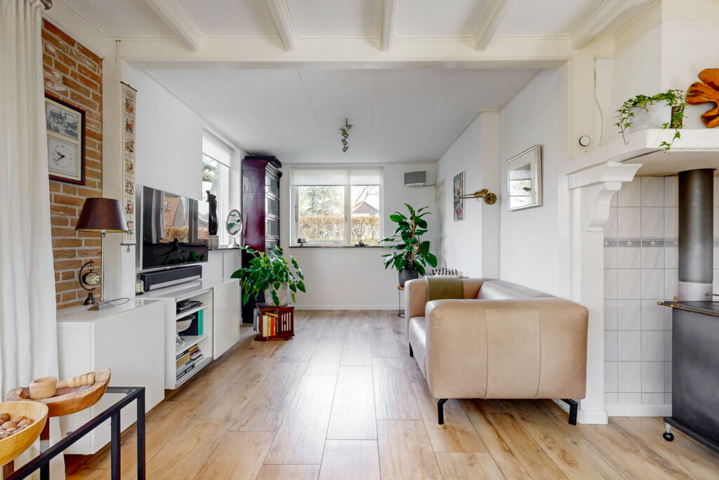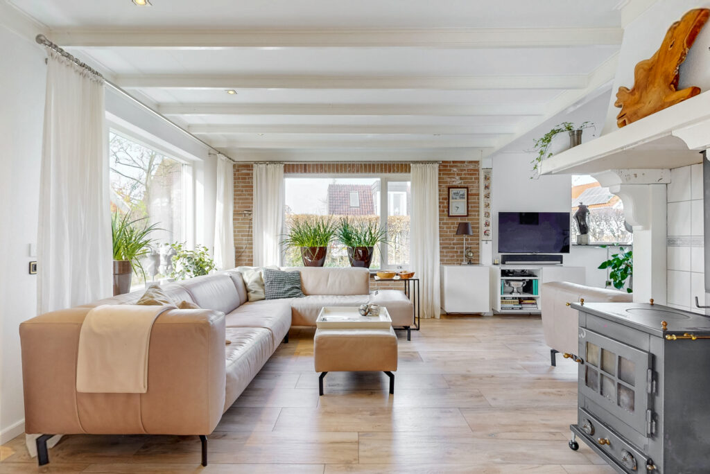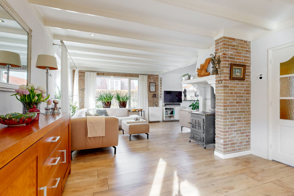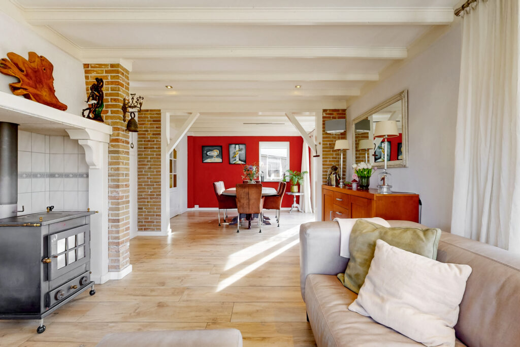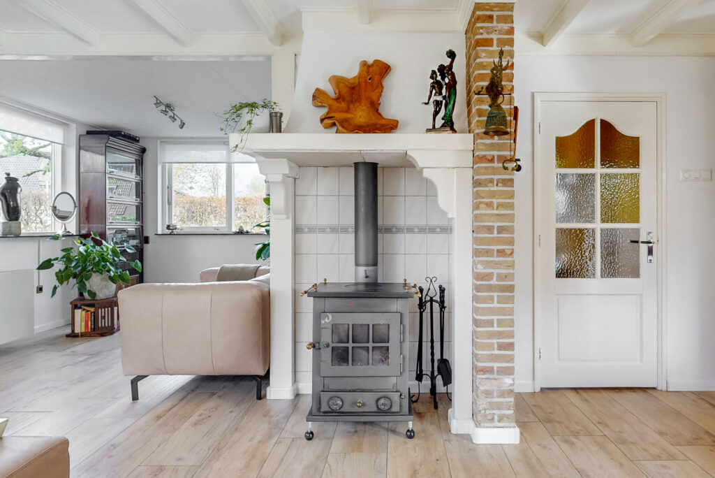 Via de ruime entree met garderobe/meterkast, toiletruimte en praktische kelderkast betreedt u de woning. De royale L-vormige woonkamer vormt het hart van het huis en is voorzien van een sfeervolle houtkachel en openslaande tuindeuren. De ruimte is afgewerkt met een stijlvolle vloerverwarmde tegelvloer. Dankzij de prettige lichtinval en de ruime opzet is dit een heerlijke plek om te ontspannen en te genieten.