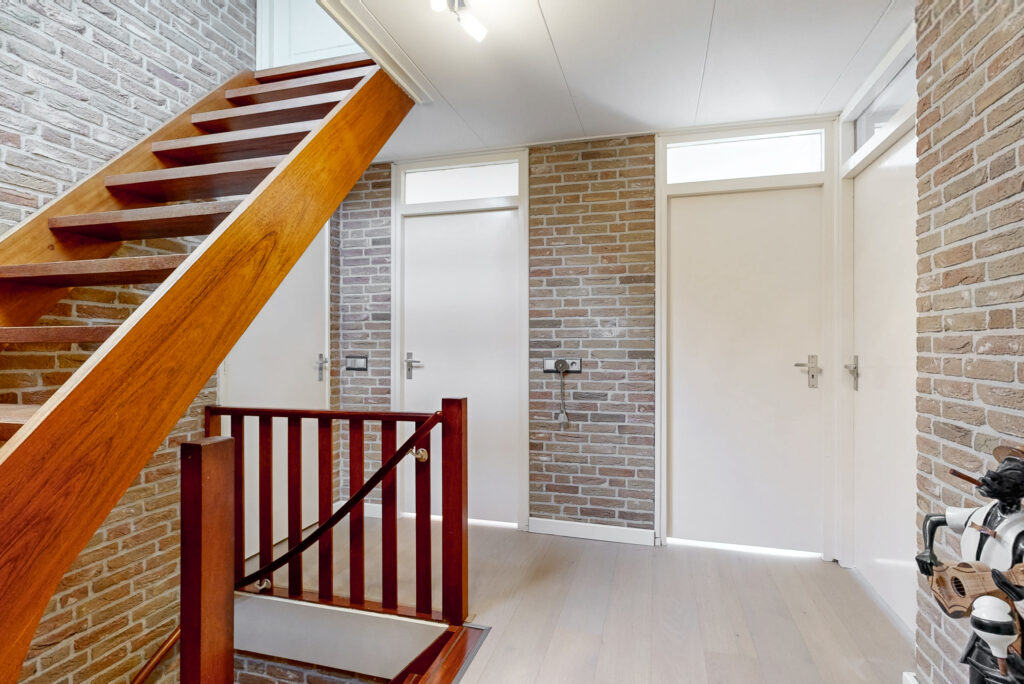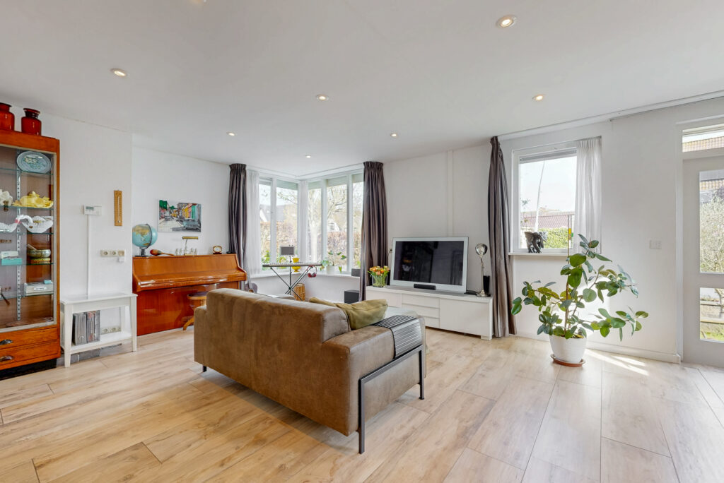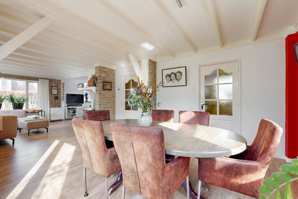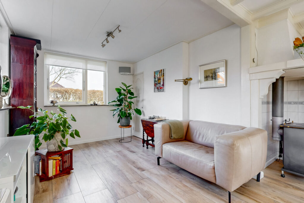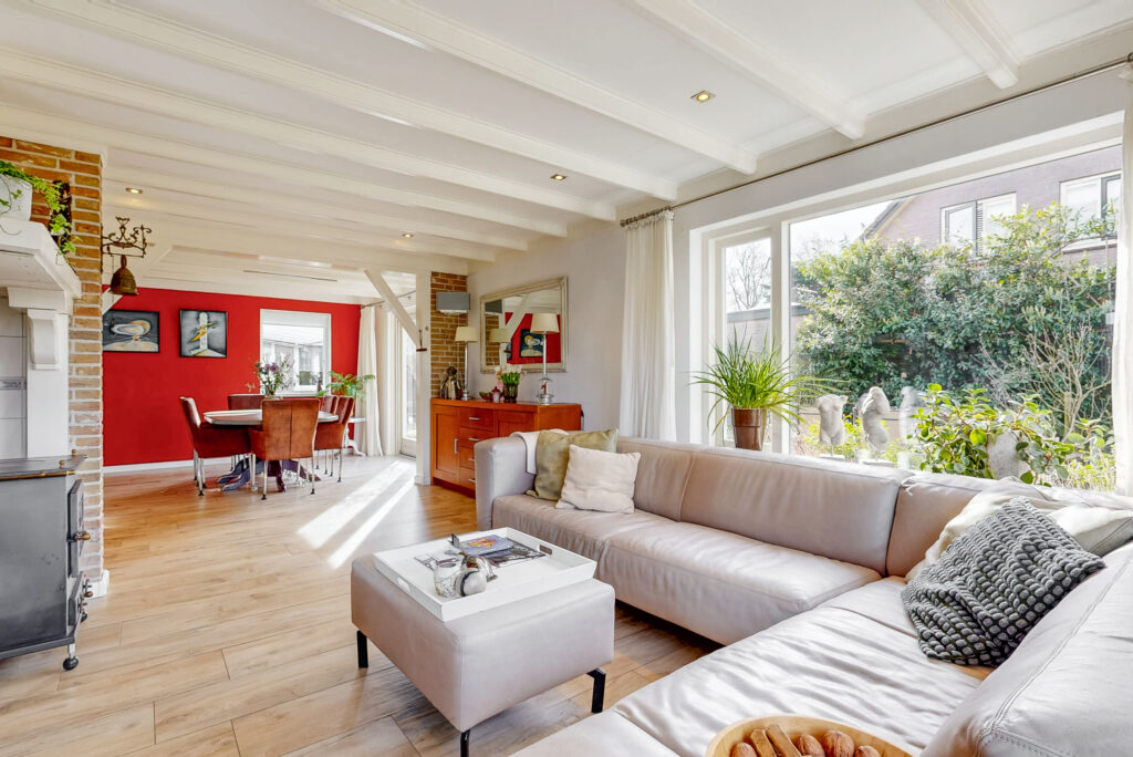 Via de ruime entree met garderobe/meterkast, toiletruimte en praktische kelderkast betreedt u de woning. De royale L-vormige woonkamer vormt het hart van het huis en is voorzien van een sfeervolle houtkachel en openslaande tuindeuren. De ruimte is afgewerkt met een stijlvolle vloerverwarmde tegelvloer. Dankzij de prettige lichtinval en de ruime opzet is dit een heerlijke plek om te ontspannen en te genieten.