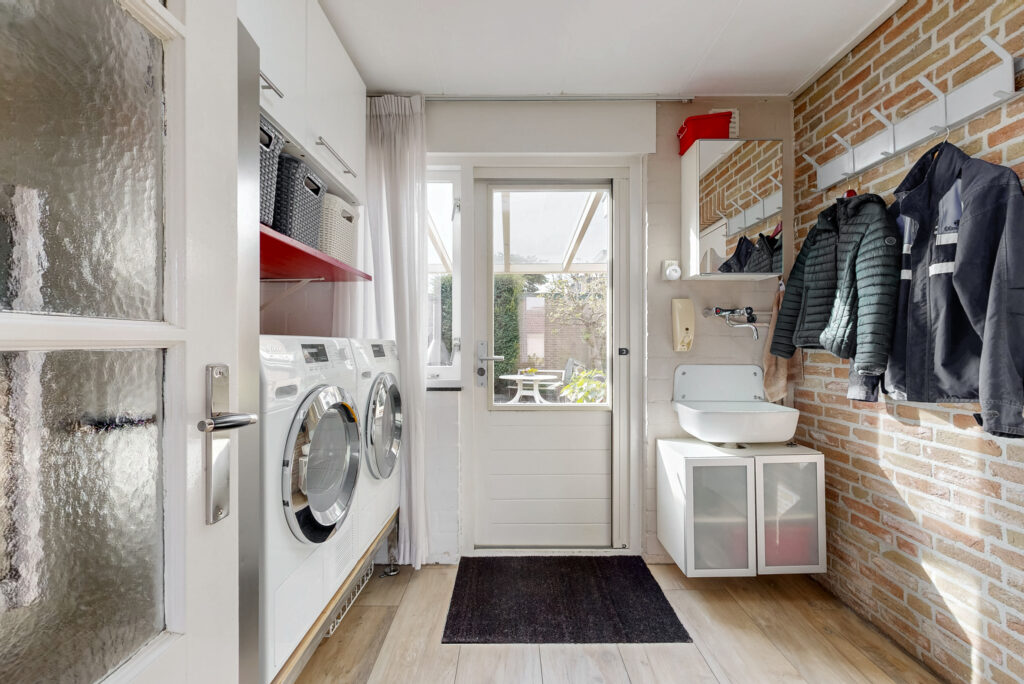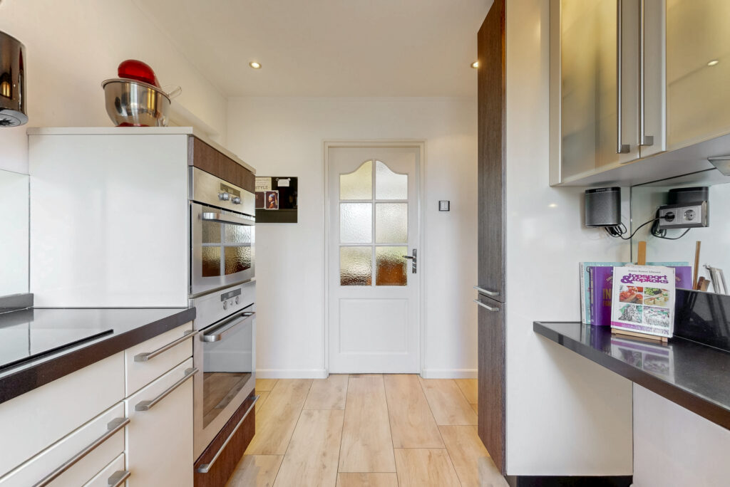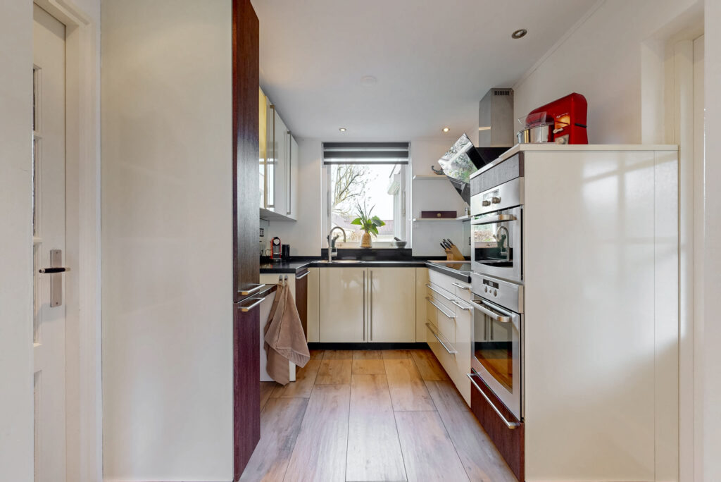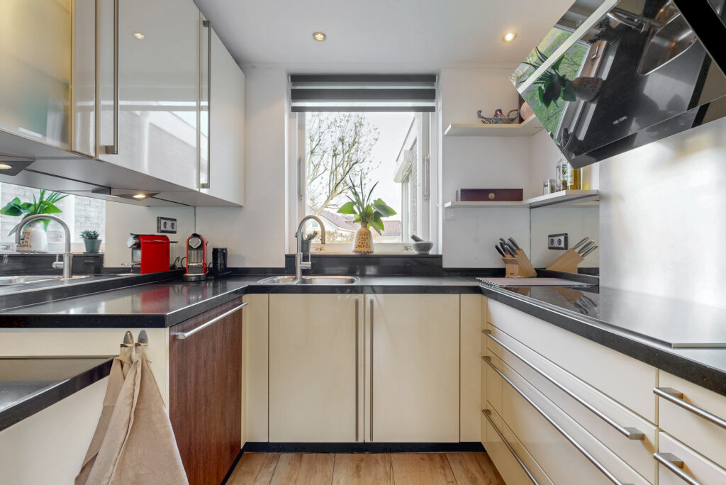 De dichte, luxe uitgevoerde U-vormige en straatgerichte keuken is compleet uitgerust met een composiet werkblad en diverse inbouwapparatuur (o.a. een ATAG-inductiekookplaat (2016) met 5 zones, een afzuigkap (2022) en een Quooker (2018). Ideaal voor kookliefhebbers. Aansluitend bevindt zich de bijkeuken met opstelling voor de wasmachine en droger. Vanuit de bijkeuken is er toegang tot een multifunctionele ruimte, perfect te gebruiken als kantoor, praktijkruimte of extra slaapkamer.