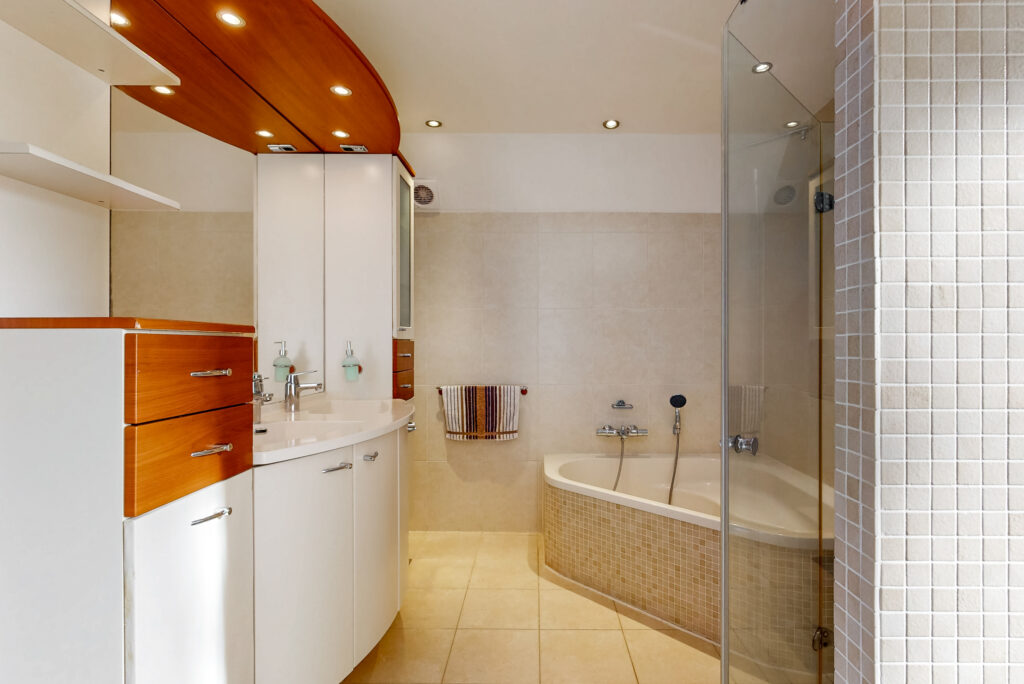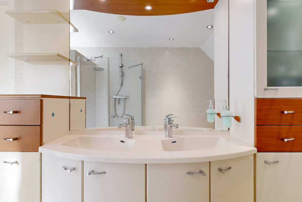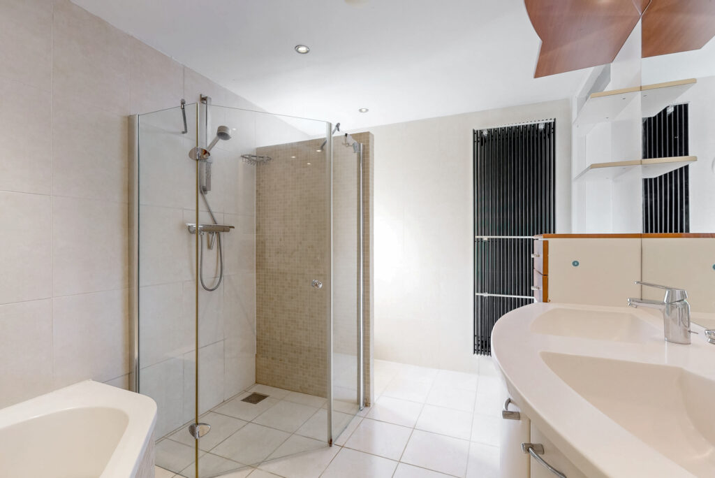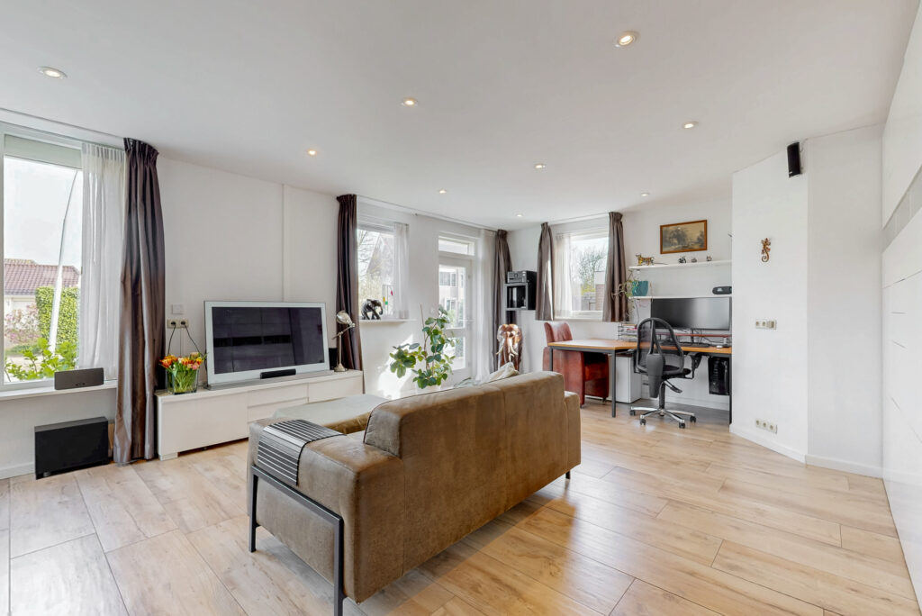 Op de eerste verdieping bevinden zich drie ruime slaapkamers, waarvan twee zijn voorzien van een dakkapel, wat zorgt voor extra ruimte en licht. De luxe badkamer is royaal opgezet en beschikt over een grote douchehoek, een comfortabel hoekligbad, een tweede toilet en een modern wastafelmeubel met dubbele wastafel.