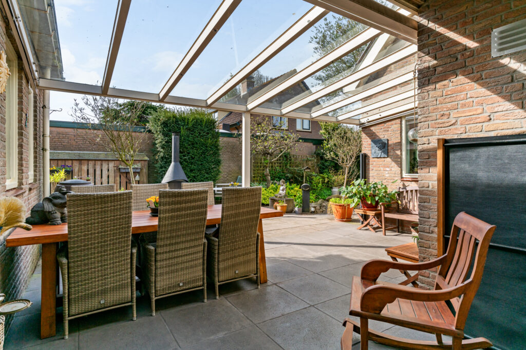 Glazen overkapping met elektrisch bedienbaar zonnescherm en houten veranda aan de achterzijde