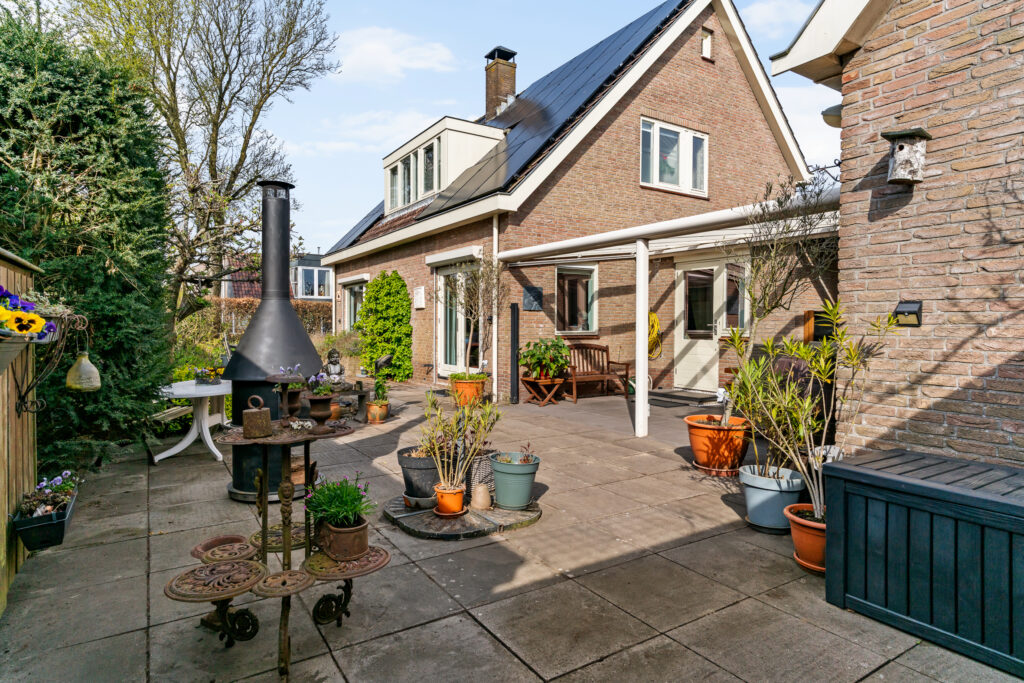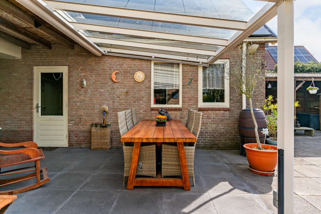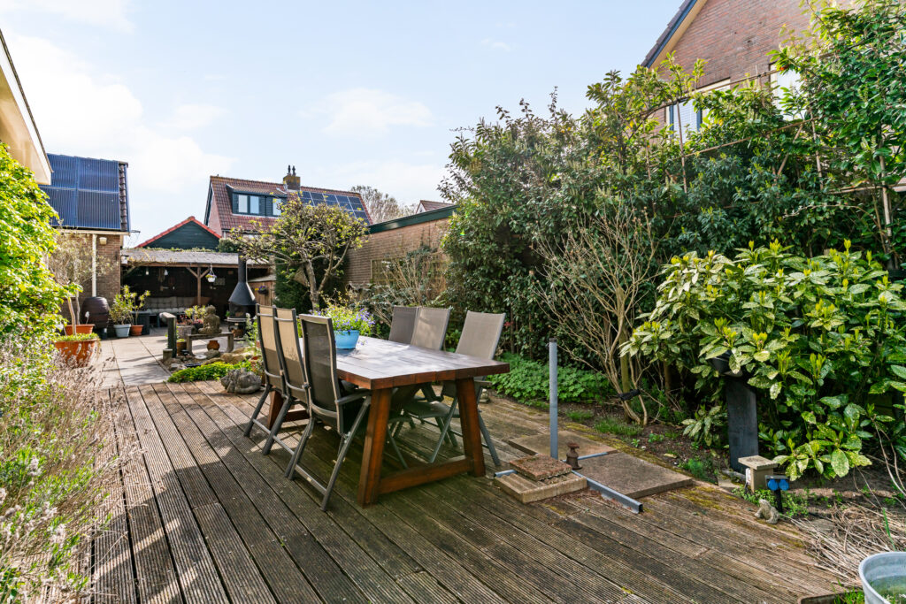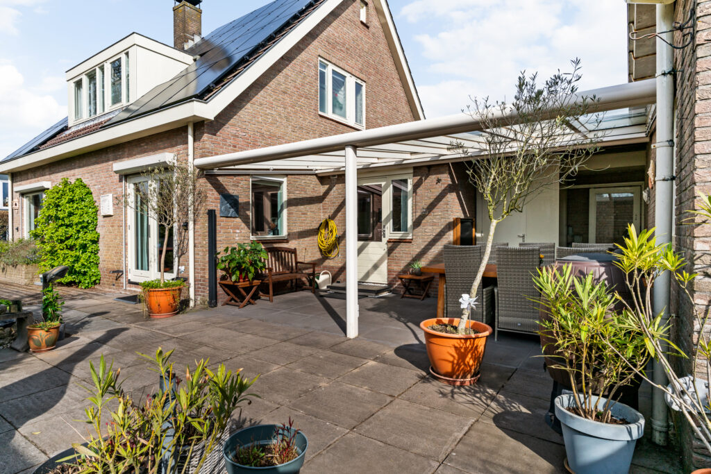 De woning is gelegen aan een rustige weg in een prettige woonwijk. De zonnige tuin op het zuiden is verzorgd aangelegd en biedt volop privacy. Aan de achterzijde bevindt zich een fraaie glazen overkapping met elektrisch zonnescherm en een houten veranda, waardoor u het hele jaar door beschut kunt genieten van het buitenleven. Daarbij blijft flink wat ruimte over om in de zon te zitten.