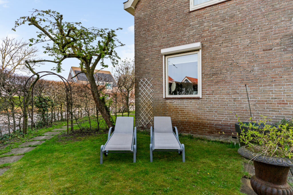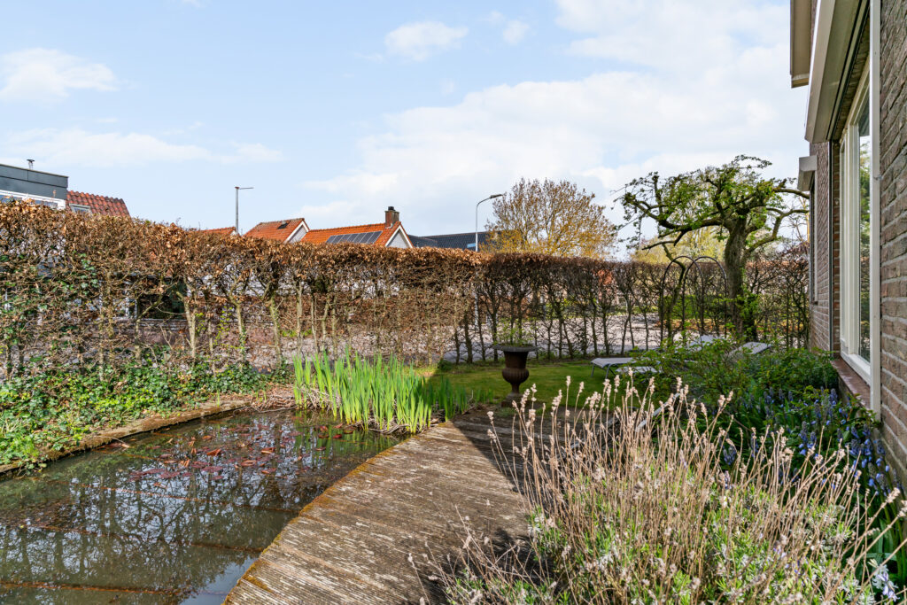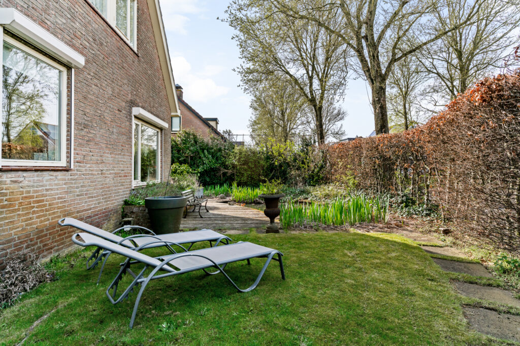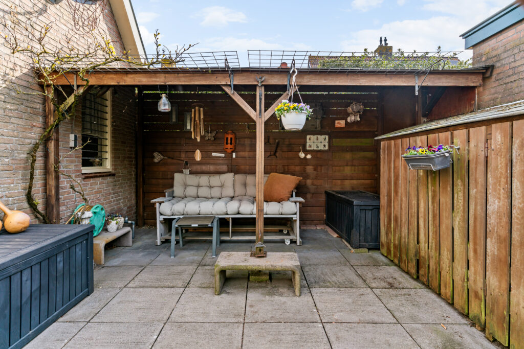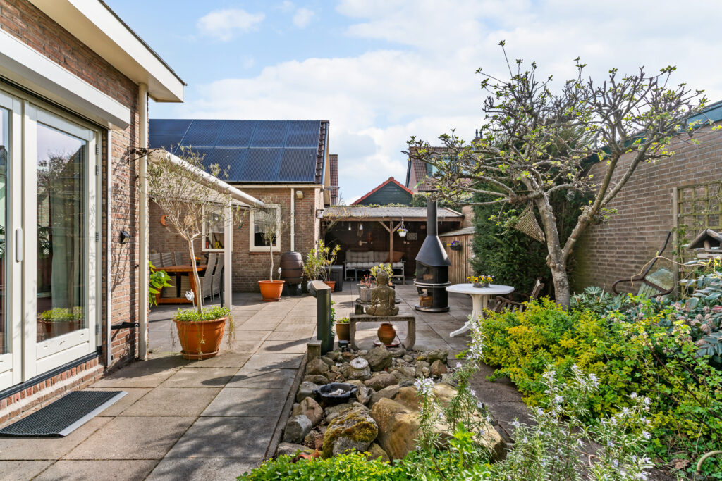 De woning is gelegen aan een rustige weg in een prettige woonwijk. De zonnige tuin op het zuiden is verzorgd aangelegd en biedt volop privacy. Aan de achterzijde bevindt zich een fraaie glazen overkapping met elektrisch zonnescherm en een houten veranda, waardoor u het hele jaar door beschut kunt genieten van het buitenleven. Daarbij blijft flink wat ruimte over om in de zon te zitten.